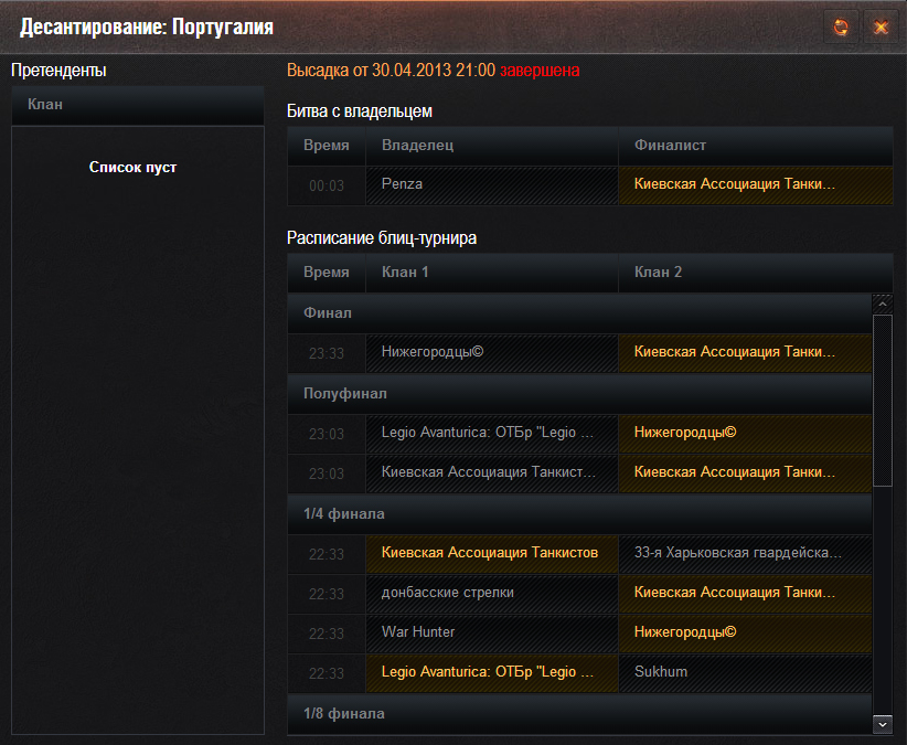 Как уже говорилось, сборная рота KAT под командованием Fock__VarzoV снова поставила суровый киевский сапог на португальщину. Последний бой с владельцем PENZA был особенно драматичен — пока выступавшая в роли щита группа семерок принимала дамаг, ст в роли меча дамажили врагов — пять 62х нанесли около 9к дамага, три бата — около 10к. Но героем стал T57 Heavy с 7,5к дамага. Так что полевой командир кроме похвалы всем участникам, особо выделяет последнюю тройку, вытянувшую концовку боя — Vitaly_GL, VBYKOVSKIY и Astramarij! Это была последняя праздничная новость. Дальше — только VODы)